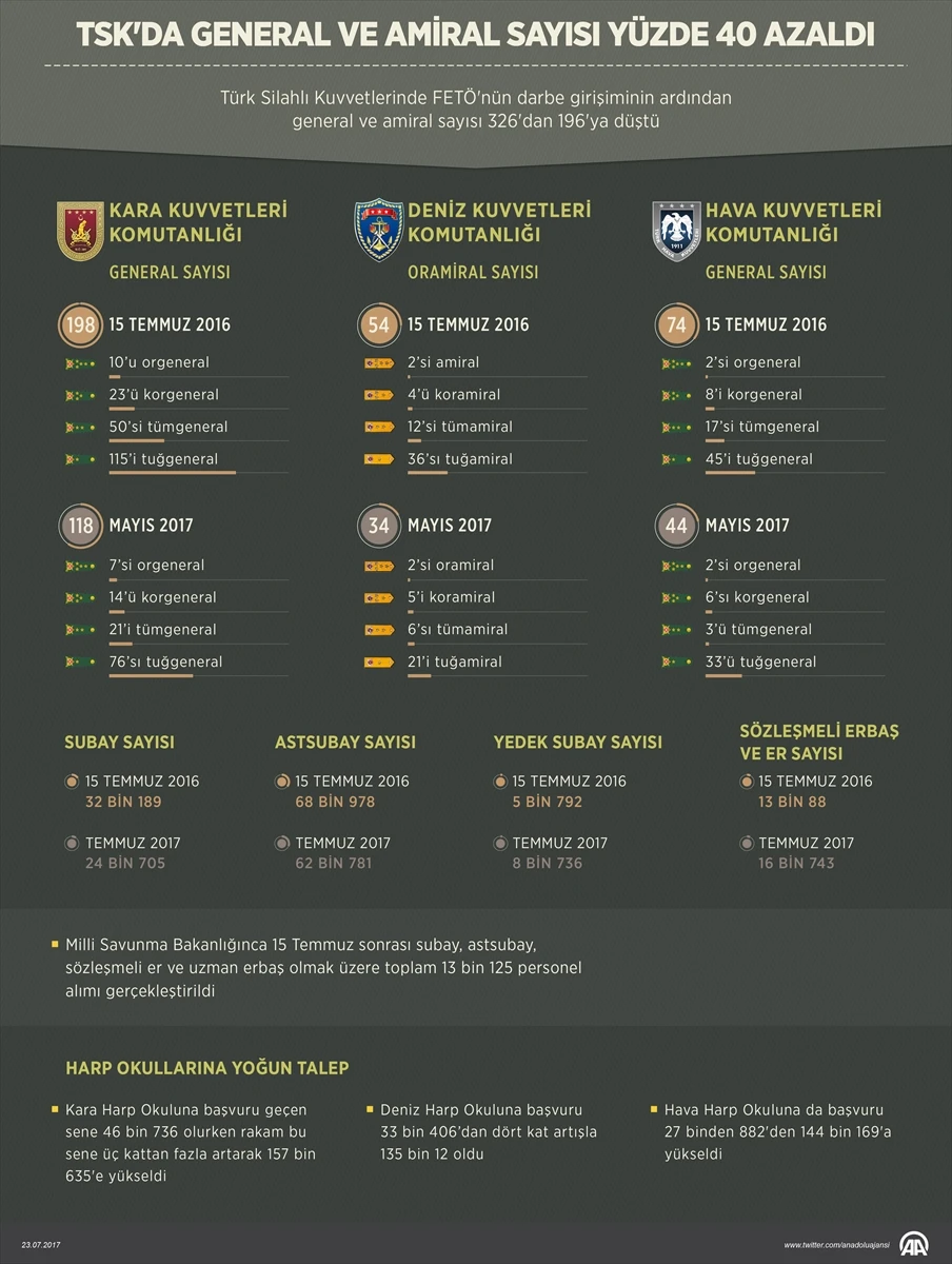TSK'da geçen yıl temmuz ayında 326 general/amiral görev yaparken, darbe girişimi sonrasında terör örgütüyle irtibatlı veya iltisaklı olduğu belirlenen general ve amirallerin ihraçlarının yanı sıra bazı üst rütbeli subayların emekliye ayrılmalarının ardından bu rakam bu yılın mayıs ayında 196 olarak belirlendi. Böylelikle TSK'daki orgeneral/amiral sayısı geçen yıla göre yüzde 40 oranında azaldı.