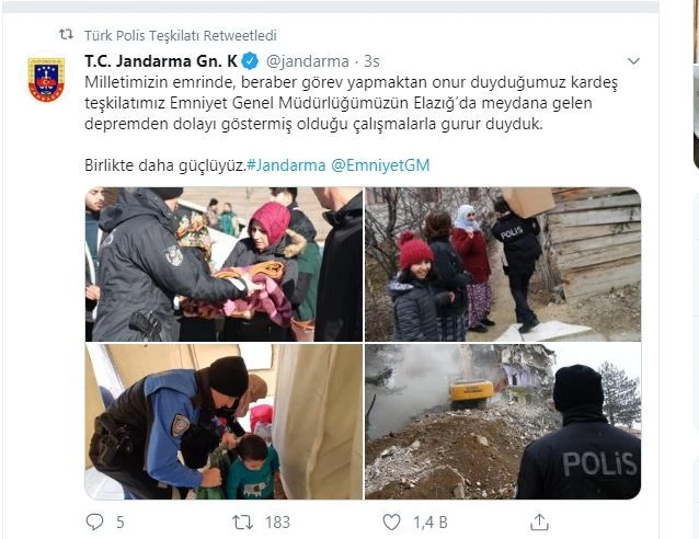 Bunun üzerine Jandarma, “Milletimizin emrinde, beraber görev yapmaktan onur duyduğumuz kardeş teşkilatımız Emniyet Genel Müdürlüğümüzün Elazığ’da meydana gelen depremden dolayı göstermiş olduğu çalışmalarla gurur duyduk. Birlikte daha güçlüyüz” paylaşımında bulundu.