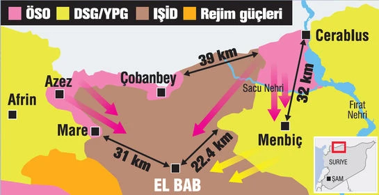 ÖSO, TSK’nın desteğiyle Cerablus’u IŞİD’den aldıktan sonra Türkiye sınırında Rai (Çobanbey)-Cerablus arasındaki bölgeyi IŞİD’den temizlemek için operasyonu genişletti. Buradaki 90 kilometrelik mesafe 40 kilometreye inmiş durumda. ÖSO, Türkiye sınırındaki bu kısmı ele geçirmek için ilerlerken, bir yandan da yönünü güneye, yani El Bab’a çevirdi. Halep’in kuzeyindeki El Bab, Türkiye sınırına 30, YPG’nin IŞİD’den aldığı Menbiç’e 25 kilometre mesafede bulunuyor. El Bab, ÖSO için de kritik bir noktada. ÖSO, Azez’den Mare hattına yönelerek buradan da El Bab’ı ele geçirmeyi hedefliyor. ÖSO’nun El Bab’ı ele geçirmesi Suriye’nin kuzeyinde, Türkiye sınırında bir güvenli bölge oluşması açısında da önem taşıyor. Ayrıca YPG’nin Suriye’nin kuzeyinde oluşturmak istediği koridorun da önünü kesmiş olacak. El Bab’ın muhalifler için bir diğer önemi ise yapılacak Menbiç operasyonu için onlara harekât alanı açacak olması... Kuzeyden Cerablus, batıdan da El Bab tarafından iki koldan Menbiç’e yönelmeyi planlayan ÖSO, Menbiç’i YPG öncülüğündeki SDG’den alıp YPG’yi Fırat’ın doğusuna çekilmeye zorlamayı hedefliyor.