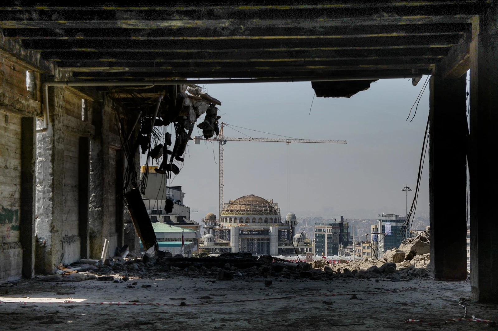 Atatürk Kültür Merkezi'nin (AKM) yıkımı devam ederken aynı karede yapımı devam eden Taksim Camii inşaatı görüldü.