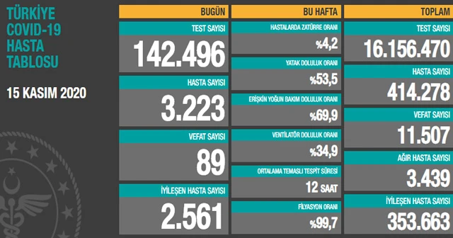 Sağlık Bakanlığı, Covid-19 bilgilendirme sayfasında Türkiye’deki güncel korona virüs tablosunu paylaştı. Tabloya göre son 24 saatte 89 kişi korona virüsten hayatını kaybederken, toplam can kaybı 11 bin 507’e yükseldi. Bugün toplam 142 bin 496 test yapılırken, 3 bin 223 kişiye de hasta tanısı konuldu. Bu rakamla beraber toplam hasta sayısı ise 414 bin 278 oldu. Bugün iyileşen 2 bin 561 kişiyle birlikte iyileşen toplam hasta sayısı 353 bin 663’ye yükseldi. Bu hafta hastalarda zatürre oranının yüzde 4.2, toplam ağır hasta sayısının ise 3 bin 439 olduğu açıklandı.