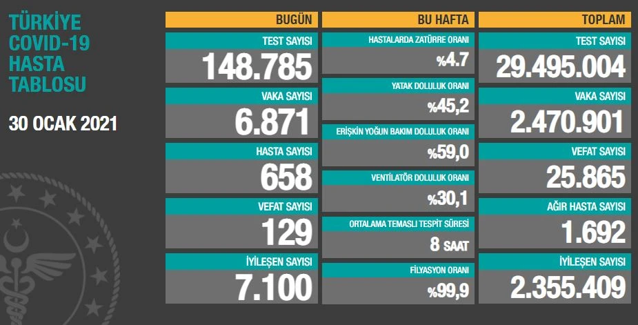 Test sayısı 29 milyon 495 bin 4'e ulaştı. Vaka sayısı 2 milyon 470 bin 901, vefat sayısı 25 bin 865, ağır hasta sayısı 1692 oldu.