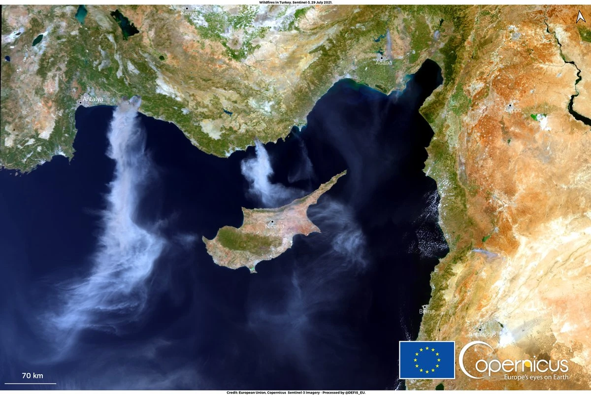 Antalya ve Mersin'deki orman yangınlarının dumanları, Avrupa Birliğinin (AB) uydusu tarafından Akdeniz üzerinde fotoğraflandı.
