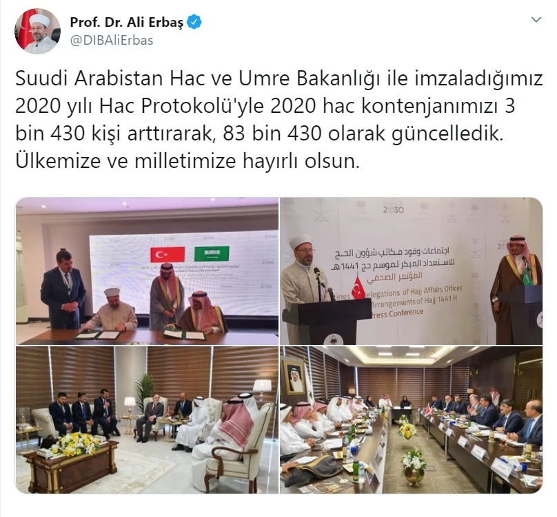 Diyanet İşleri Başkanı Prof. Dr. Ali Erbaş, beraberindeki heyetle 2020 yılı hac organizasyonuna ilişkin temaslarda bulunmak üzere gittiği Mekke’de Suudi Arabistan Hac ve Umre Bakanı Muhammed Salih bin Tahir Benten ile Hac Protokolü imzaladı. Protokolle Türkiye için belirlenen hac kontenjanı 3 bin 430 kişi arttırılarak, 83 bin 430'a yükseltildi. Suudi Bakan bin Tahir Benten ile yapılan görüşmede Türk hacı adaylarına sunulan hizmetler de değerlendirildi.
