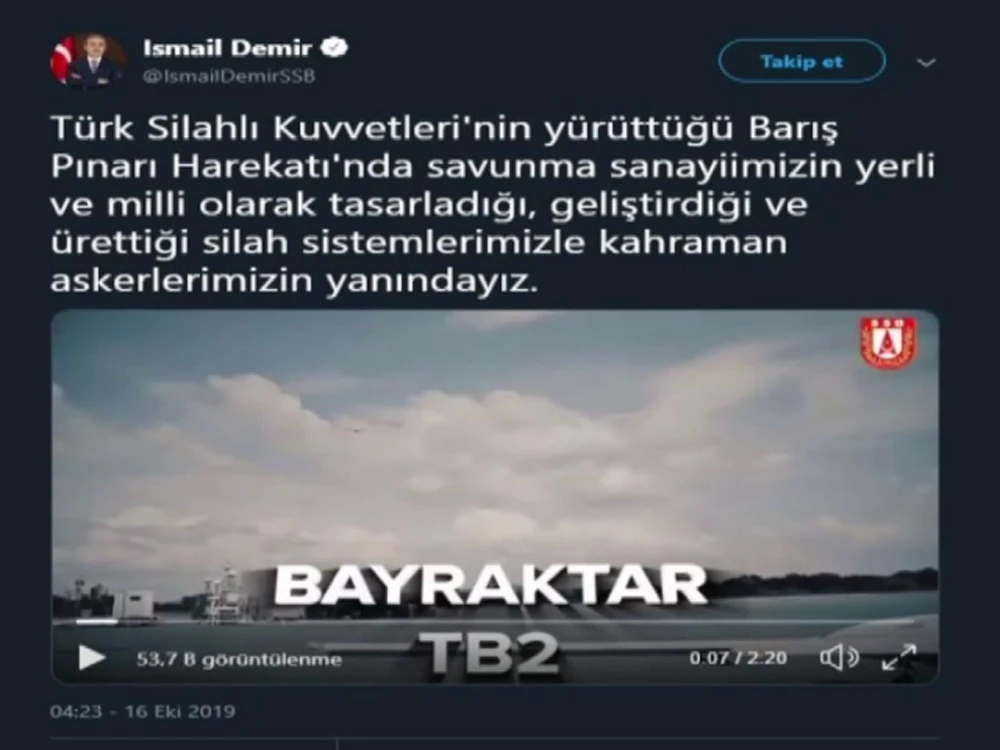Cumhurbaşkanlığı Savunma Sanayii Başkanı Demir, sosyal medya hesabı üzerinden Türk Silahlı Kuvvetleri envanterine katılan yerli ve milli imkanlarla tasarlanıp üretilen silahların görüntülerini içeren bir video paylaştı. Demir, “Biz Savunma Sanayii Başkanlığı, vakıf şirketleri, özel sektör firmaları, kamunun ilgili kurumları, araştırma merkezleri, üniversiteler ve teknoparklarla, topyekun Türk savunma sanayis sektörünün bütün paydaşlarıyla birlikte her zaman olduğu gibi bugün de Barış Pınarı Harekatı’nda silahlı kuvvetlerimizle birlikteyiz, onların yanındayız. Helikopterimizden insansız hava araçlarımıza, akıllı mühimmatlardan füzelere, piyade tüfeğinden zırhlı araçlarımıza ve elektronik harp sistemlerimize varıncaya kadar Mehmetçik’in sahada ihtiyaç duyduğu ve kullandığı sistemler çok büyük oranda yerli ve millidir, Türk mühendislerinin tasarladığı, geliştirdiği ve ürettiği ürünlerdir” açıklamasında bulundu.