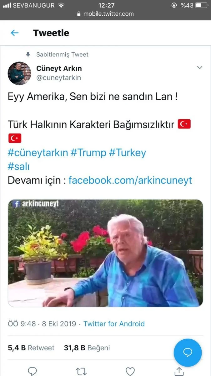 Cüneyt Arkın, “Ey Amerika, sen bizi ne sandın Lan! En güçlü devletleri ayağında çarık bile yokken yenerek denize döktük. Ey Amarika, sen demokrasi düşmanısın. Türk Halkının Karakteri Bağımsızlıktır” dedi.