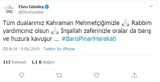 Sanatçı Ebru Gündeş twitter hesabından, “Tüm dualarımız Kahraman Mehmetçiğimizle. Rabbim yardımcınız olsun. İnşallah zaferinizle oralar barış ve huzura kavuşur” dedi.