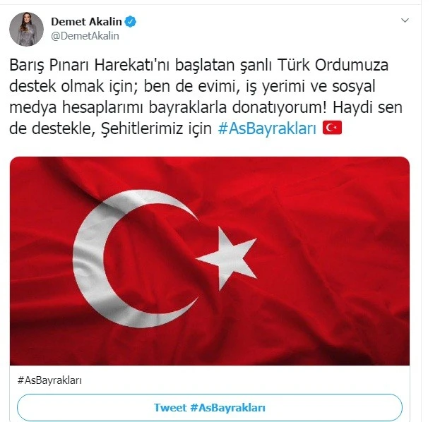 Şarkıcı Demet Akalın da twitter hesabından “Barış Pınarı Harekatı’nı başlatan şanlı Türk Ordumuza destek olmak için; ben de evimi, iş yerimi ve sosyal medya hesaplarımı bayraklarla donatıyorum! Haydi sen de destekle, Şehitlerimiz için #AsBayrakları” notunu düştü.