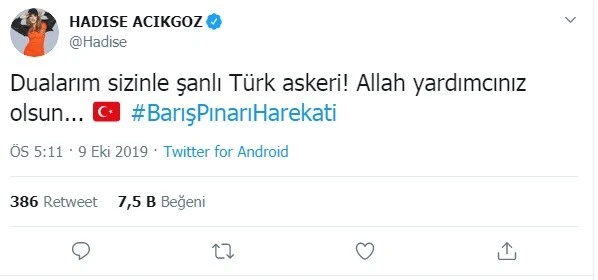 Sanatçı Hadise’de twitter hesabından Barış Hareketı’na destek veren sanatçılar arasında yer alarak, “Dualarım sizinle şanlı Türk askeri. Allah yardımcınız olsun” dedi.