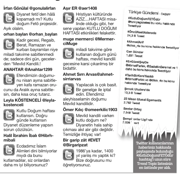 Diyanet İşleri Başkanlığı tarafından her yıl 14-20 Nisan tarihleri arasında tertiplenen “Kutlu Doğum Haftası”nın bir FETÖ projesi olduğunu yazdığımız manşetimiz büyük yankı uyandırdı. Haberimizde ilk olarak 1989 yılında başlatılan uygulamanın 1994’te FETÖ’cülerin ‘Nisan ayında yapalım’ teklifiyle amacından çıkarıldığına ve zamanla dini yozlaştıran sazlı sözlü bir festivale dönüştürüldüğüne dikkat çekmiştik. Diyanet, haberimiz üzerine bir açıklama gönderdi. Açıklamada kutlamaların FETÖ ile hiçbir ilgisinin olmadığını savunulurken, Müslümanların içini sızlatan garabetler ise görmezden gelindi. İşte o açıklamadan pasajlar ve cevapları: