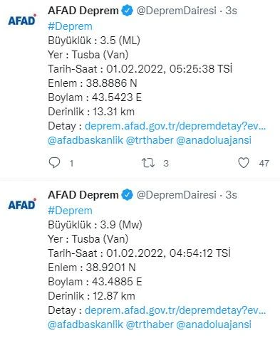 AFAD tarafından gelen son dakika haberine göre; 1 Şubat Salı sabah saatlerinde Van'ın Tuşba ilçesinde deprem oldu. Peş peşe yaşanan depremlerin şiddetleri 3.9 ile 3.5 olarak açıklandı.