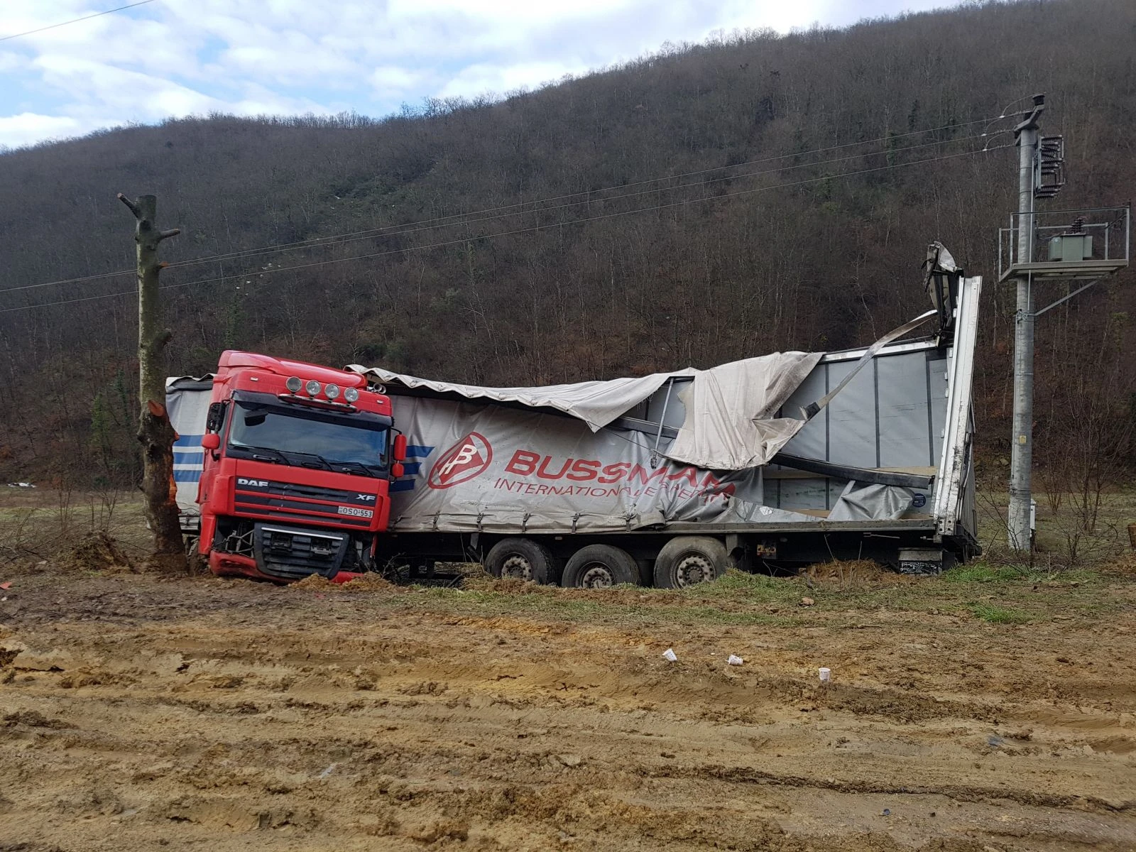 Yoldan çıkan tırı kurtarma çalışmaları devam ediyor.