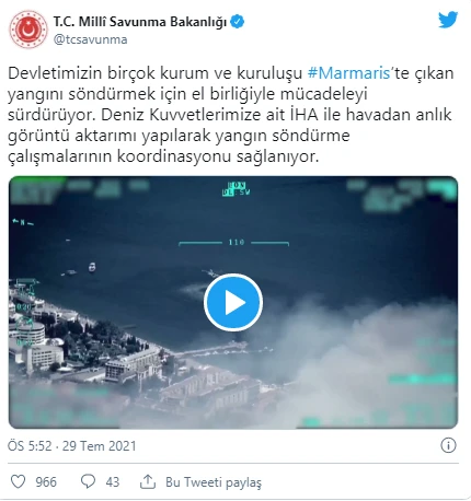 "Devletimizin birçok kurum ve kuruluşu Marmaris’te çıkan yangını söndürmek için el birliğiyle mücadeleyi sürdürüyor. Deniz Kuvvetlerimize ait İHA ile havadan anlık görüntü aktarımı yapılarak yangın söndürme çalışmalarının koordinasyonu sağlanıyor."