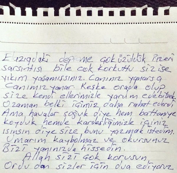 "Elazığ'daki depreme çok üzüldük. Bizleri sarsıntısı bile çok korkuttu, siz ise yıkım yaşamışsınız. Canınız yanarsa canımız yanar. Keşke orada olup size kendi ellerimizle yardım edebilsek. O zaman içimiz daha rahat ederdi. Ama havalar soğuk diye hem battaniye koyduk hem de kardeşliğimizle içiniz ısınsın diye size bunu yazmak istedim. Umarım kaybolmaz ve okursunuz. Bizi yanınızda hissedin. Allah sizi çok korusun. Ordu'dan sizler için dua ediyoruz."