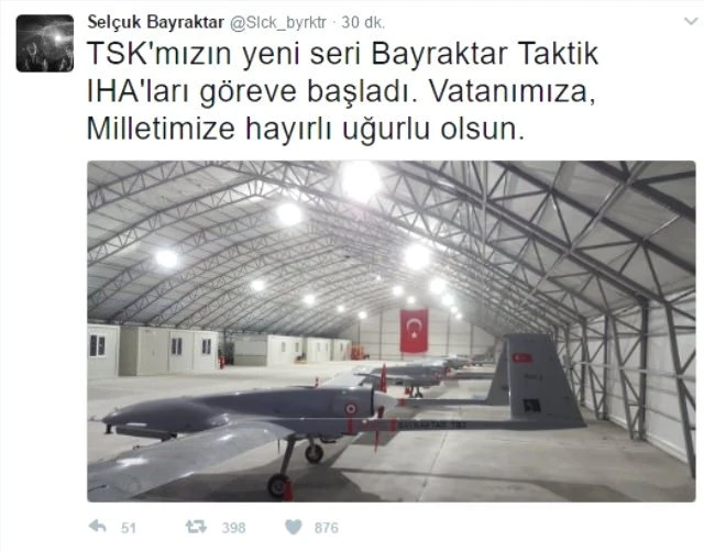 Bayraktar paylaşımında "TSK'mızın yeni seri Bayraktar Taktik IHA'ları göreve başladı. Vatanımıza, Milletimize hayırlı uğurlu olsun." ifadelerini kullandı.
