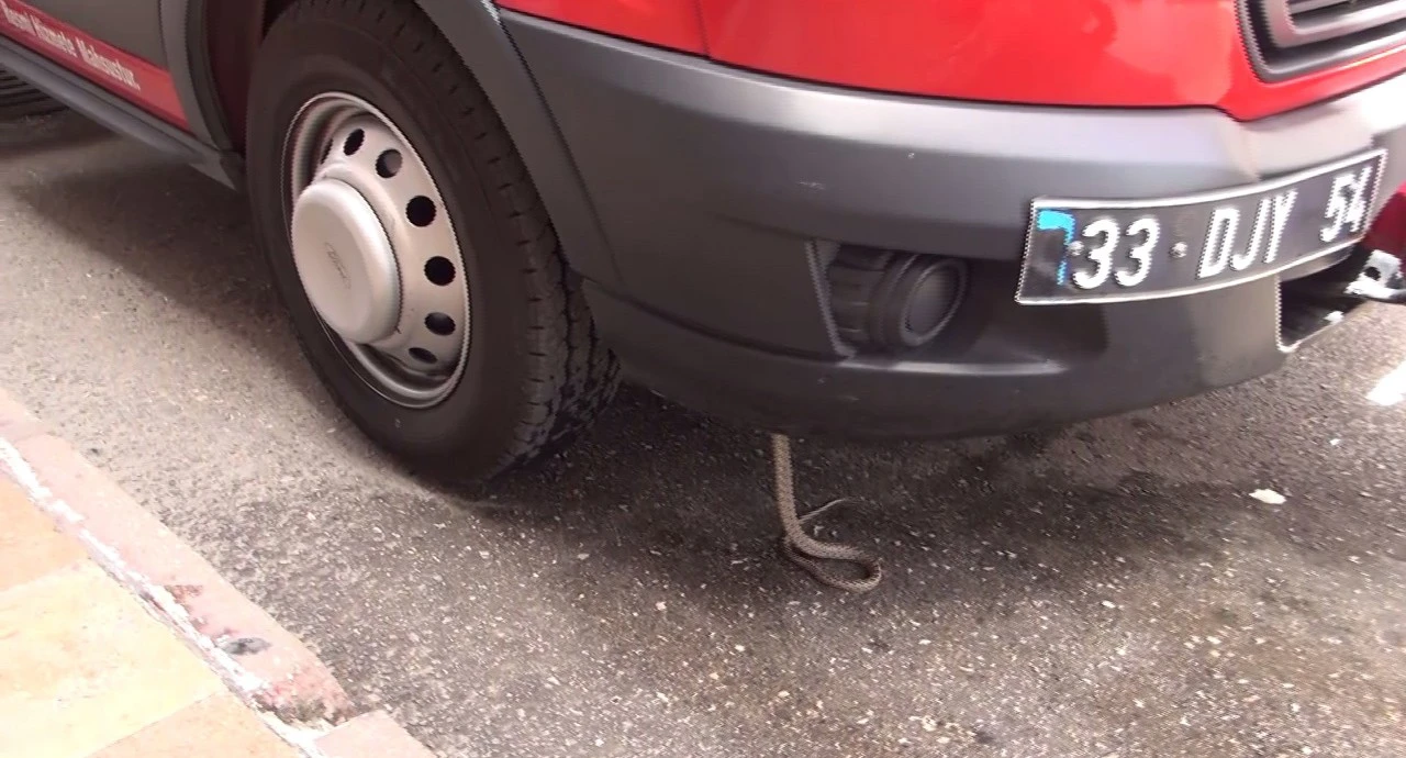 Olay, Saray Mahallesi'nde meydana geldi. Bir otomobilin altına 1 metre uzunluğunda yılan girdiğini gören vatandaşlar durumu itfaiye ekiplerine bildirdi.