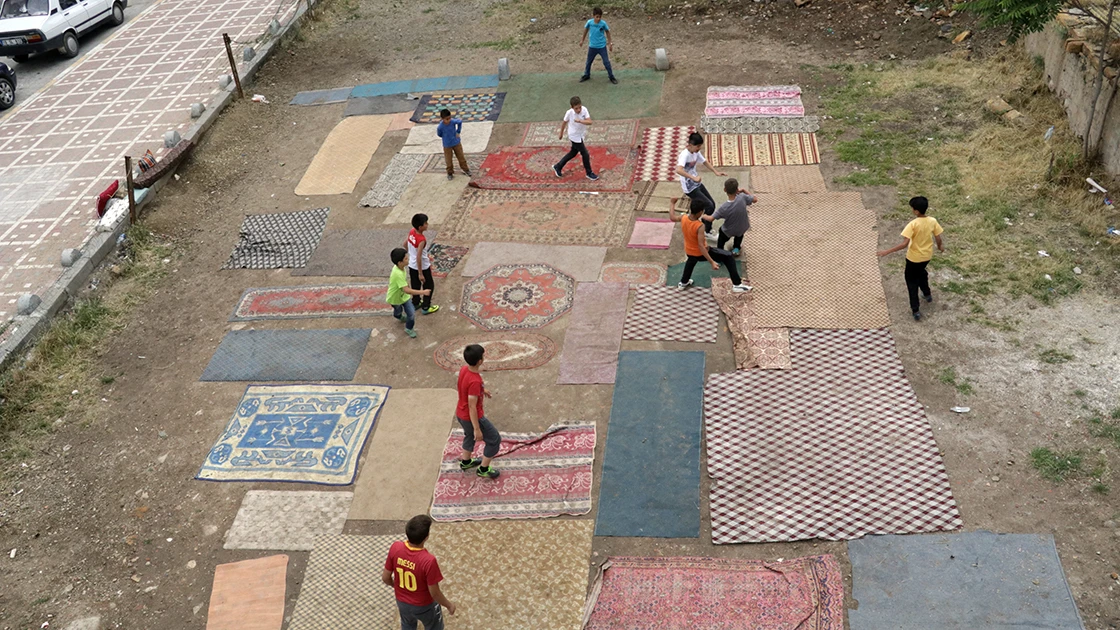 Çocuklar evden getirdikleri eski halı ve kilimleri sererek "halı saha" görünümü verdikleri alanda futbol oynuyordu