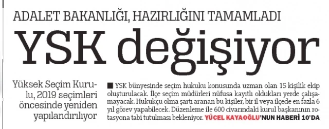 İlgili kanun teklifi, bugün Meclis Başkanlığına sunulacak. Türkiye Gazetesi'nin Eylül ayında duyurduğu teklifte, 16 Nisan referandumunda tarıtşma konusu olan mühürlü oylarla ilgili düzenlemenin de yer alması bekleniyor. YSK’nın yeniden yapılandırılması ile kurum bünyesinde seçim hukuku konusunda uzman olan 15 kişilik bir ekip oluşturulacak. İlçe seçim müdürleri nüfusa kayıtlı oldukları yerde görev alamayacak, bulundukları yerde en fazla 6 yıl görev yapabilecek ve yeni atanacak seçim müdürlerinde hukukçu olma şartı aranacak. İlçe seçim müdürlerinin görev yerleri, hâkim ve savcılarda olduğu gibi bölgelere ayrılarak belirlenecek. Bu durumda, Doğu ve Güneydoğu’da görev alacak seçim müdürlerinin görev süresi gerekirse 6 yıldan az olabilecek. YSK’nın yapısının değiştirilmesi ile sayıları 600 civarında olan ilçe seçim müdürünün rotasyona tabi tutulması bekleniyor. Dün bir te-levizyon kanalına değerlendirmede bulunan AK Parti Grup Başkanvekili Mustafa Elitaş teklifin, 11 Aralık’tan önce kanunlaşmasını beklediklerini söyledi.