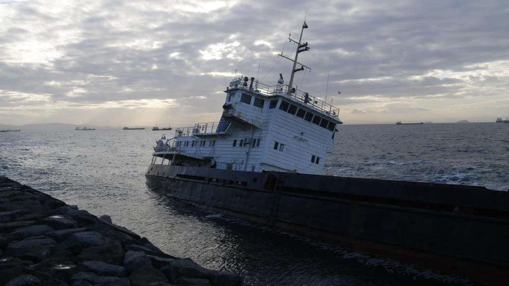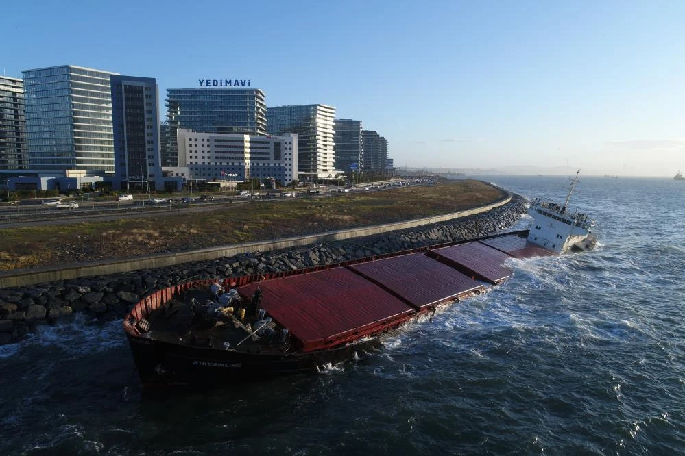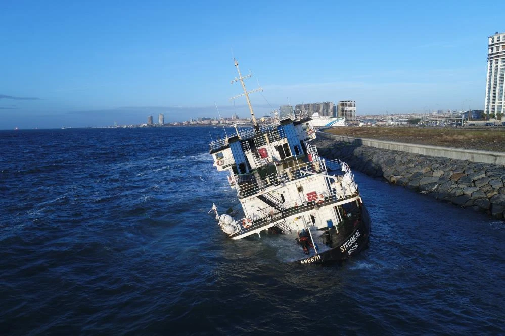 Marmara Denizi'nde şiddetli fırtınanın etkisiyle geçtiğimiz hafta, Zeytinburnu, Ahırkapı'da Morini Limanına kayıtlı ve Comoros Bayraklı "STREAMLINE" isimli kargo gemisi karaya sürüklenmişti. Gemide mahsur kalan Azerbaycanlı 53 yaşındaki Kaptan İlham Hüseyinov ve yağcı 23 yaşındaki Nurlan Glinjov çalışmaların ardından kurtarılmıştı. Gemi kurtarılmayı beklerken dün akşam etkili olan fırtına nedeni ile sol kısmı tamamen suların içerisinde kaldı. Sol tarafının suların kapladığı geminin yan yattığı görüldü. Öte yandan dev dalgaların dövdüğü gemide suların zaman zaman güverte kısmına kadar çıktığı görüldü. Geminin son durumu havadan drone kamerası ile görüntülendi.