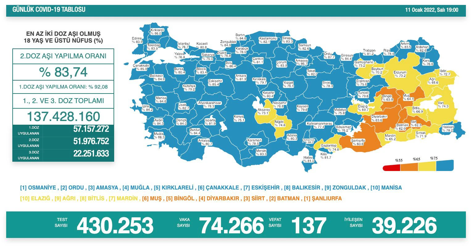 Verilerde, aşılamada önde giden illere de yer verildi. Bakanlığın tablosuna göre yüzde 88,2 ile Türkiye'de en çok aşılamanın gerçekleştirildiği Osmaniye’yi, Ordu, Amasya, Muğla, Kırklareli, Çanakkale Eskişehir, Balıkesir, Zonguldak ve Manisa takip etti. Bakanlığın tablosuna göre yüzde 60,6 ile Türkiye'de en az aşılamanın gerçekleştirildiği Şanlıurfa’yı sırasıyla Batman, Siirt, Diyarbakır, Bingöl, Muş, Mardin, Bitlis, Ağrı ve Elazığ takip etti.