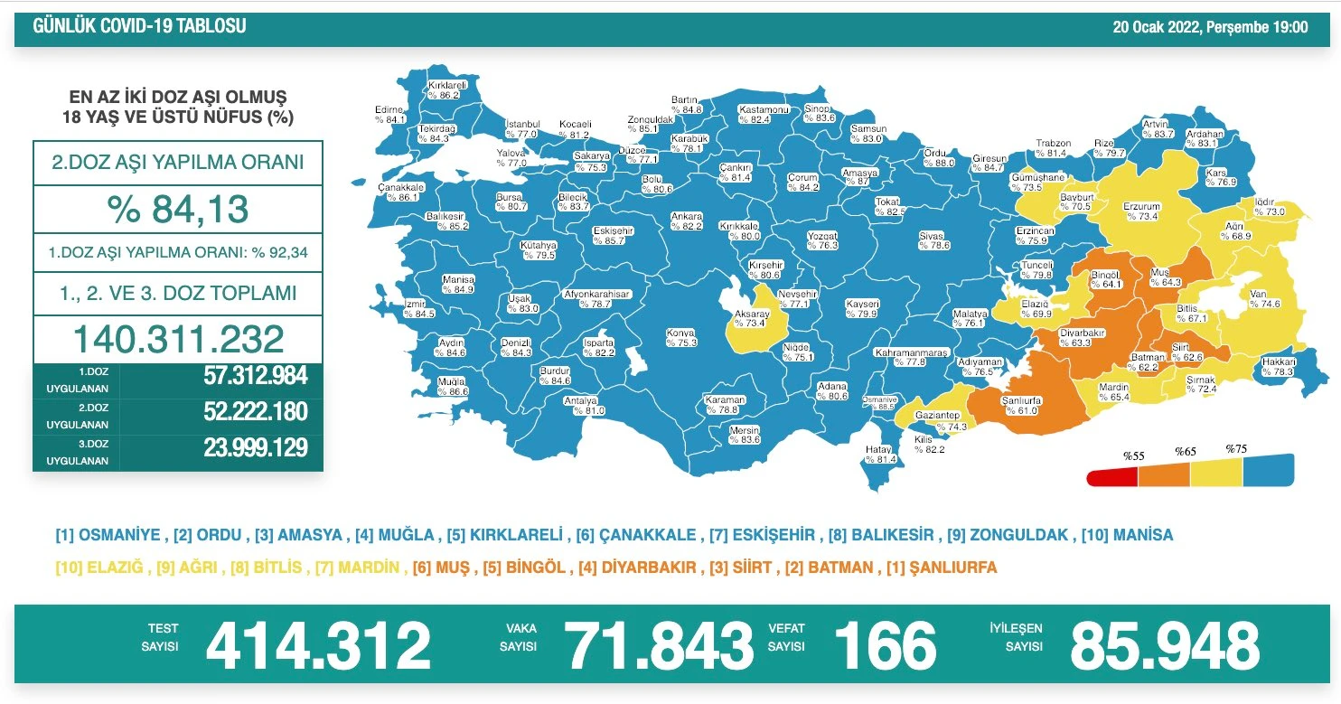 Tabloda 2 doz aşılama verilerine de yer verildi. En az 2 doz aşı olmuş 18 yaş üzeri nüfusu kapsayan verilere göre; Türkiye'de 2. doz aşılama ortalama yüzde 84,20 oldu. 1. doz ortalaması yüzde 92,37 olurken, 1., 2. ve 3. doz aşısını olan vatandaşların sayısı toplamda 140 milyon 743 bin 552’ye yükseldi.