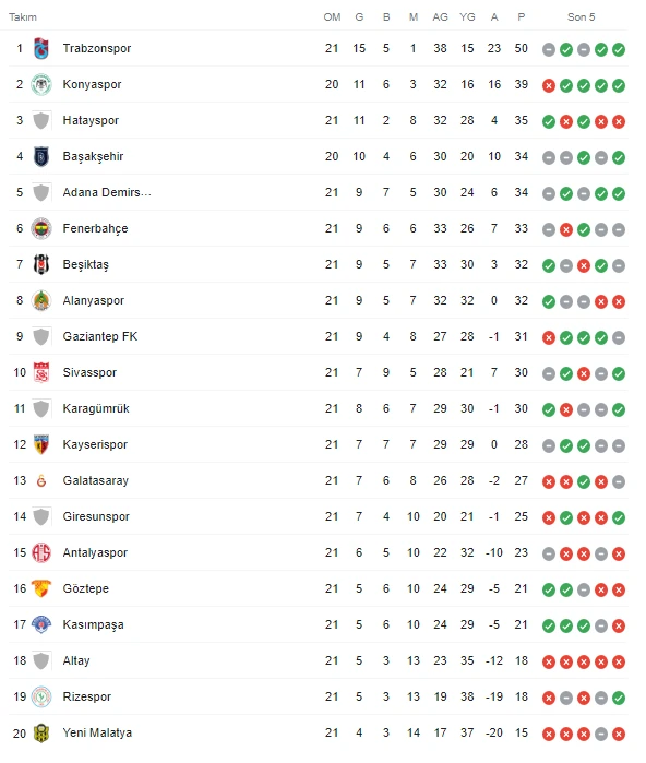 Süper Lig'de 21. haftanın ardından görünüm ve oluşan puan durumu