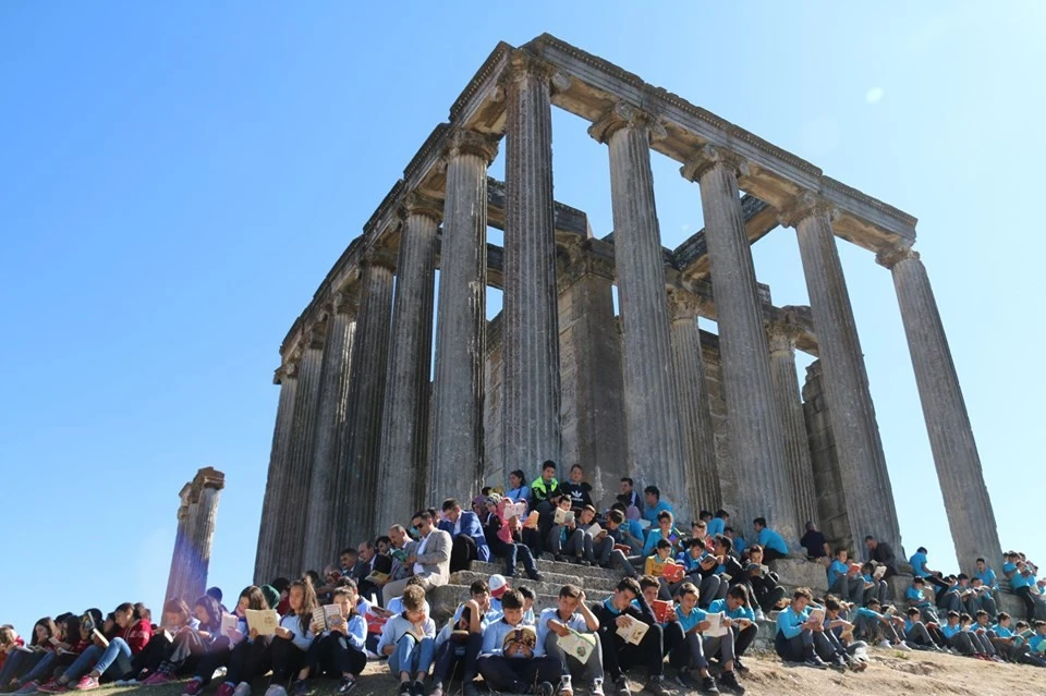 Çavdarhisar Halk Eğitim Merkezi Müdürü Musa Kazak, ''Anadolu topraklarında en iyi korunmuş Zeus Tapınağı'na ev sahipliği yapan ve "İkinci Efes" olarak adlandırılan Çavdarhisar Aizanoi Antik Kenti'nde, 'Tarihin Sayfalarında Kitap Okuyoruz' adlı proje kapsamında bir araya gelen yaklaşık 450 öğrenci ve öğretmenimiz, hem tarihi mekanlara, hem de kitap okumaya dikkat çekmeye çalıştı.