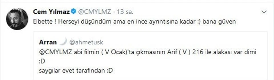 Cem Yılmaz; Ozan Güven, Seda Bakan, Zafer Algöz ve Özkan Uğur gibi isimlerin bulunduğu güçlü kadrosuyla dikkat çeken yeni filmi ArifV216'nın heyecanını yaşıyor. Yeni yılın ilk günlerinde sevenleriyle buluşmaya hazırlanan Cem Yılmaz vizyon tarihi olarak 5 Ocak’ı seçmişti. Filmin adının ‘ArifV216’ olmasından yola çıkan bir takipçisi Yılmaz’a Roma rakamıyla beş anlamına gelen ‘V’nin filmin vizyon tarihiyle bir ilgisi olduğunu düşündüğünü yazdı. Yılmaz da buna kendisine has üslubuyla, "Elbette! Her şeyi düşündüm ama en ince ayrıntısına kadar. Bana güven" ifadelerini kullandı.