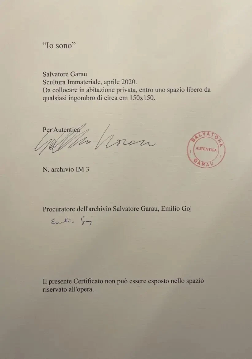 İtalya’da görünmeyen heykel binlerce euroya alıcı buldu. İtalyan heykeltraş Salvatore Garau'nun “Io sono” (Benim) adlı görünmeyen eseri Milano'da bulunan Art- Rite müzayede evinde satışa çıktı. Sanatseverlerden biri açık arttırmada materyalsiz eser için 15 bin Euro ödedi. Alıcıya eser ile ilgili sadece orijinalliğinin kanıtı olan garanti belgesi verildi. Garau, görünmez eserini daha önce, Milano'daki Scala Meydanı'nında düzenlenen sergisi dahilinde bir beyaz çerçeve içerisinde sergilemişti.