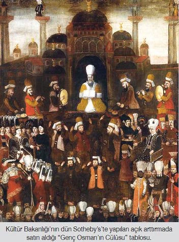 Londra’nın ünlü mezat şirketi Sotheby’s’te dün yapılan “İslâm Dünyası Sanatı” müzayedesinde 200 bin sterlin (809 bin lira) açılış fiyatı ile arttırmaya çıkan ve dünyada tek olan “Genç Osman’ın Cülusu” tablosunu, en yüksek fiyatı veren Kültür Bakanlığı satın aldı. Bakanlığın 430 bin sterline aldığı tablo, vergisi ile yaklaşık 540 bin sterline (2 milyon 185 bin lira) mâlolacak.
