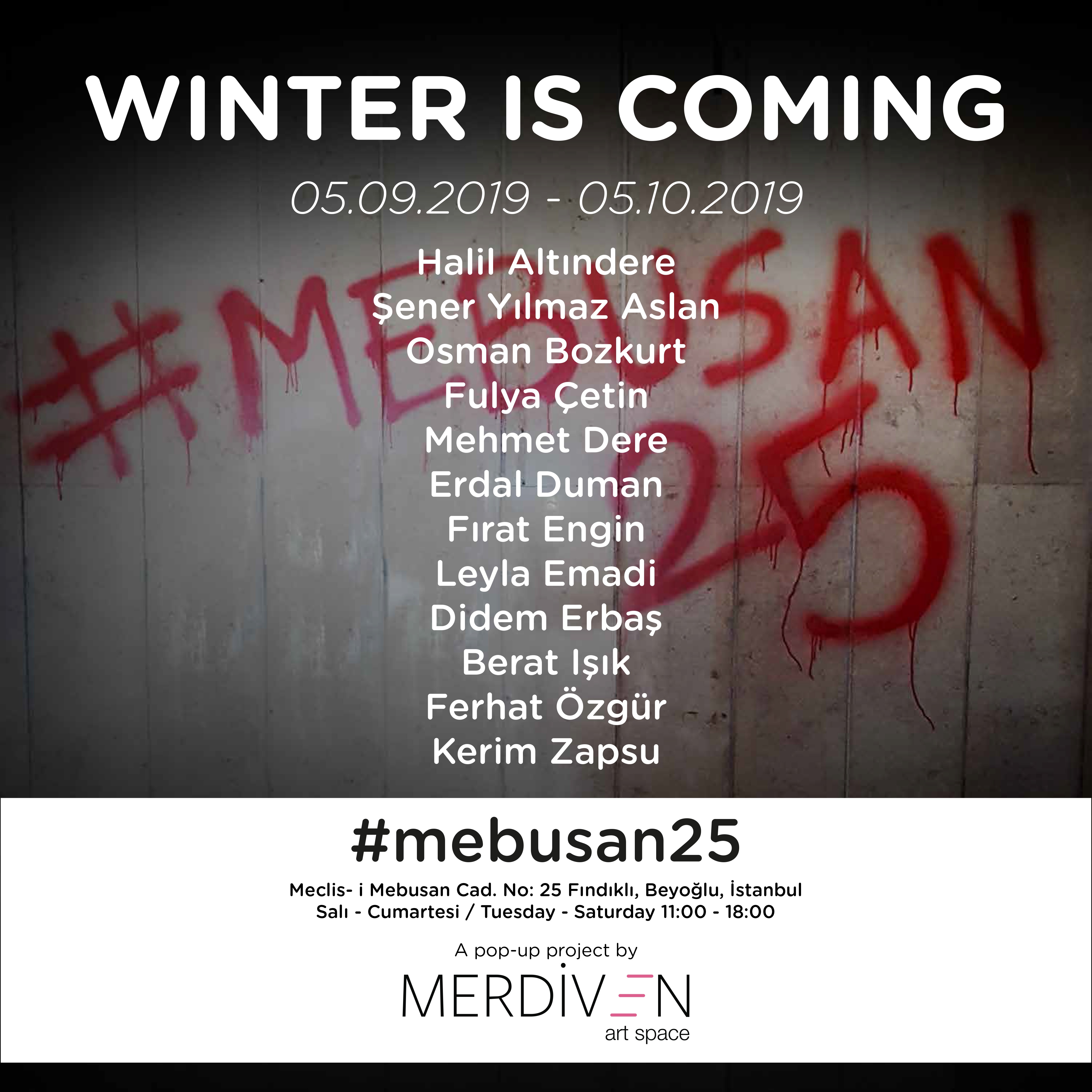 Ayrıca bir diğer sergi de Merdiven Art Space imzalı bir pop-up projesi olarak kurgulanan Winter is Coming, giderek güçleşen mekân temin ve kullanım zorluklarına alternatif bir bakışla metruk bir binanın dönüştürülmesi sonucu hayata geçirildi. Kentsel dönüşümün sıradaki adayı olarak yıkılacağı günü bekleyen, #mebusan25; yakın geçmişin mimari ve bürokratik tüm izlerini bünyesinde barındıran post-modernist kimliğiyle sanatçıları kucaklıyor.