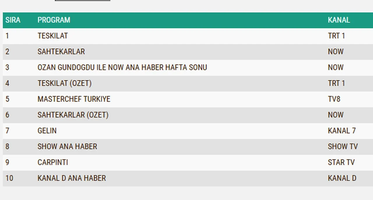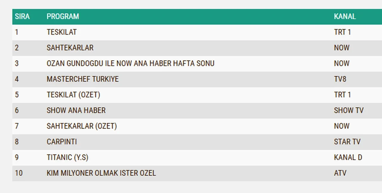 Dün akşam Show TV’de Bereketli Topraklar dizisi 4. Bölümüyle, Star TV’de Çarpıntı dizisi 11. Bölümüyle, Now TV’de Sahtekarlar dizisi 7. Bölümüyle, TRT1’de ise Teşkilat dizisi 158. Bölümüyle ekranlarda yer aldı. Aynı saatlerde Kanal D’de Titanik isimli yabancı sinema filmi, ATV’de Kim Milyoner Olmak İster yarışması seyirciye keyifli anlar yaşatırken, TV8’de MasterChef’te yarışmacılar mavi takımın kaptanı olmak için mücadele etti.
