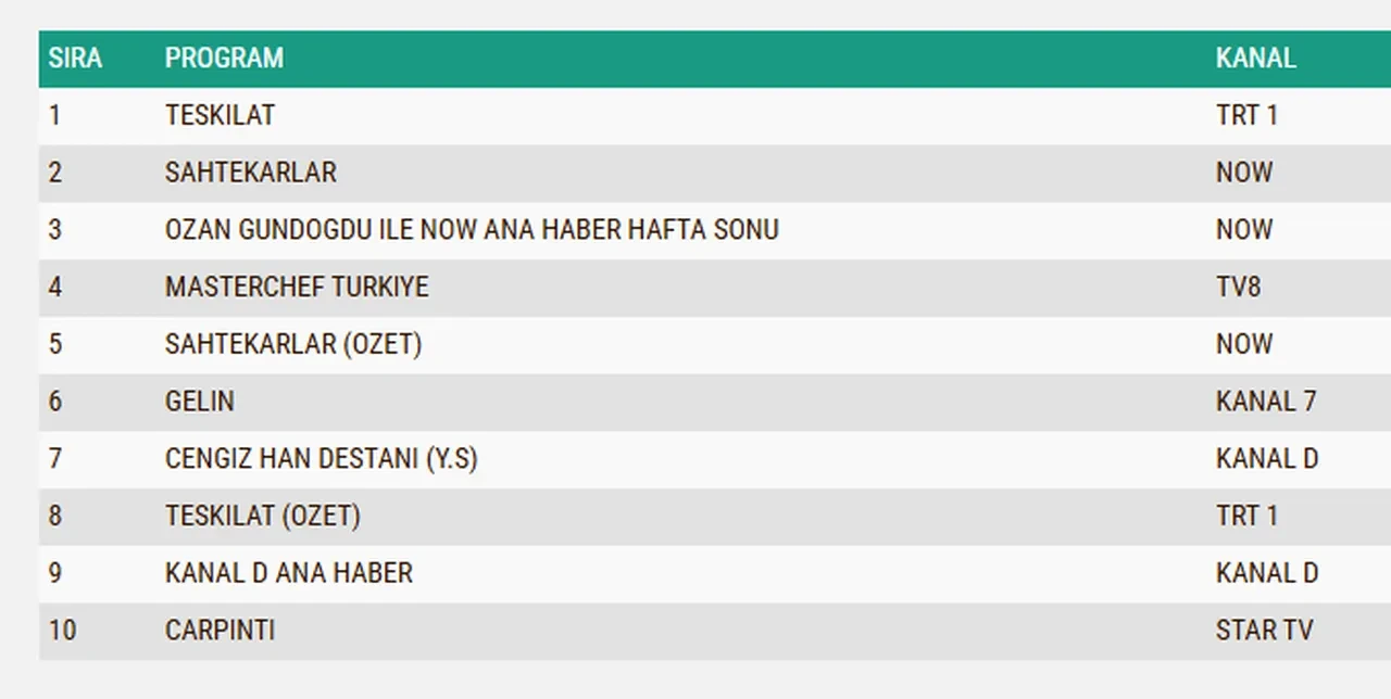 Dün akşam Star TV’de Çarpıntı dizisi 12. Bölümüyle, Now TV’de Sahtekarlar dizisi 8. Bölümüyle, TRT1’de ise Teşkilat dizisi 159. Bölümüyle ekranlara gelirken Show TV’de Bereketli Topraklar dizisi final bölümüyle son kez seyirci karşısına çıktı. Aynı saatlerde Kanal D’de Cengiz Han Destanı isimli yabancı sinema filmi yayınlanırken, ATV’de Kim Milyoner Olmak İster, TV8’de ise MasterChef Türkiye ile yarışma heyecanı yaşandı.