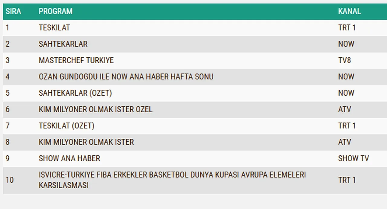 30 Kasım Pazar akşamı Show TV’de Bereketli Topraklar, Star TV’de Çarpıntı, Now TV’de Sahtekarlar, TRT1’de ise Teşkilat dizilerinin yeni bölümleri yayınlandı. Ancak TRT1’de Teşkilat dizisinden hemen önce Türkiye İsviçre basketbol maçı milyonları ekran başına topladı. Devasa bütçelerle hazırlanan dizilerin ekran yolculuğuna devam edip etmeyeceğini belirleyen en büyük unsurlardan olan reyting sonuçları ise günün ilk saatleri itibariyle beklenmeye başlandı…
