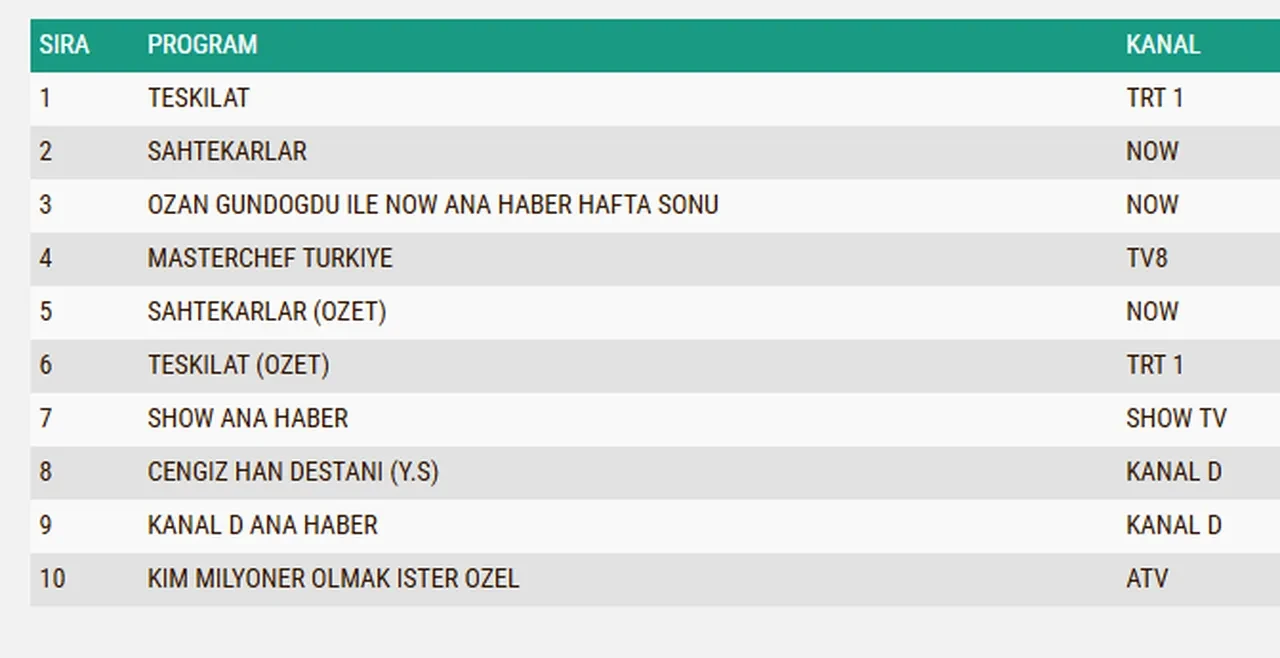 Dün akşam en çok hangi yapımın izlendiğini gösteren 30 Kasım 2025 reyting sonuçları açıklandı. Buna göre dün akşam tüm gruplarda da en çok izlenen yapım TRT1'de yayınlanan Teşkilat dizisi oldu. İşte 30 Kasım 2025 reyting sonuçlarının ayrıntıları...