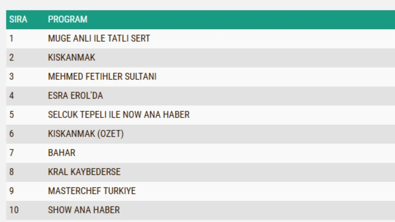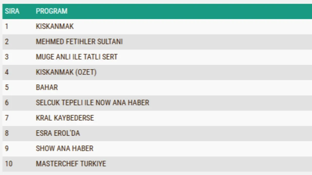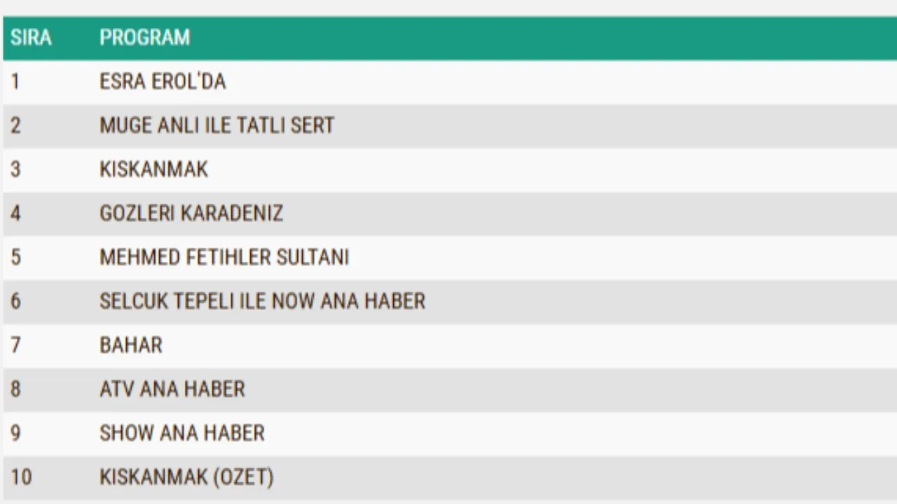 4 Kasım Salı akşamı Show TV’de Bahar dizisi 57. Bölümüyle, ATV’de Gözleri Karadeniz 10. Bölümüyle, Now TV’de Kıskanmak 8. Bölümüyle, Star TV’de Kral Kaybederse 25. Bölümüyle TRT1’de ise Mehmed: Fetihler Sultanı 57. Bölümüyle ekranlarda yer aldı. Heyecan dolu olayların yaşandığı bölümlerin ardından şimdi ise reyting sonuçlarına ilişkin heyecan başladı…