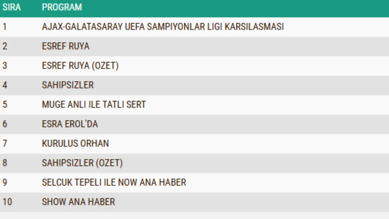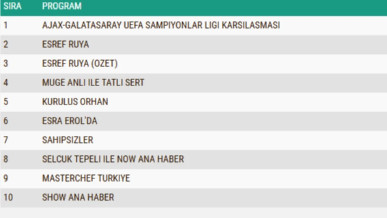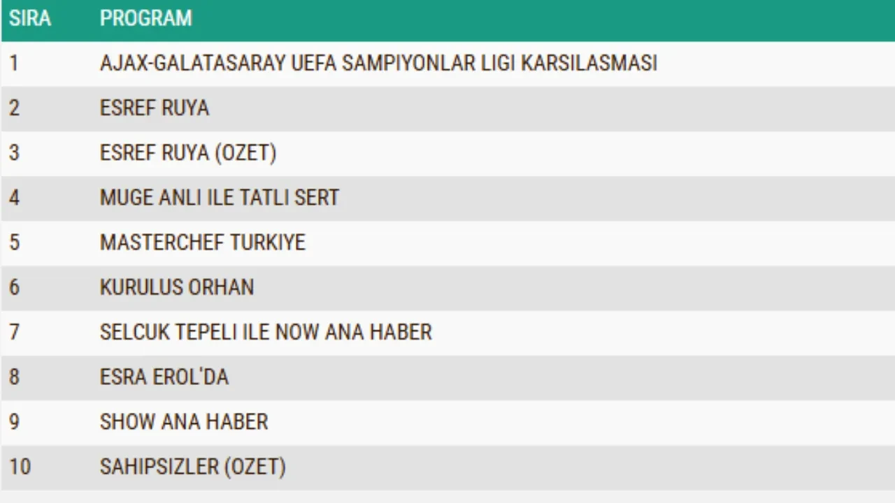 5 Kasım 2025 Çarşamba gününe ait reyting sonuçları açıklandı. Yayınlanan listeye göre dün akşam en çok izlenen program TRT1'de yayınlanan Ajax-Galatasaray maçı oldu. Dizi bazında bakıldığında ise tüm kategorilerde en çok izlenen yapım Kanal D'de yayınlanan Eşref Rüya dizisi oldu.