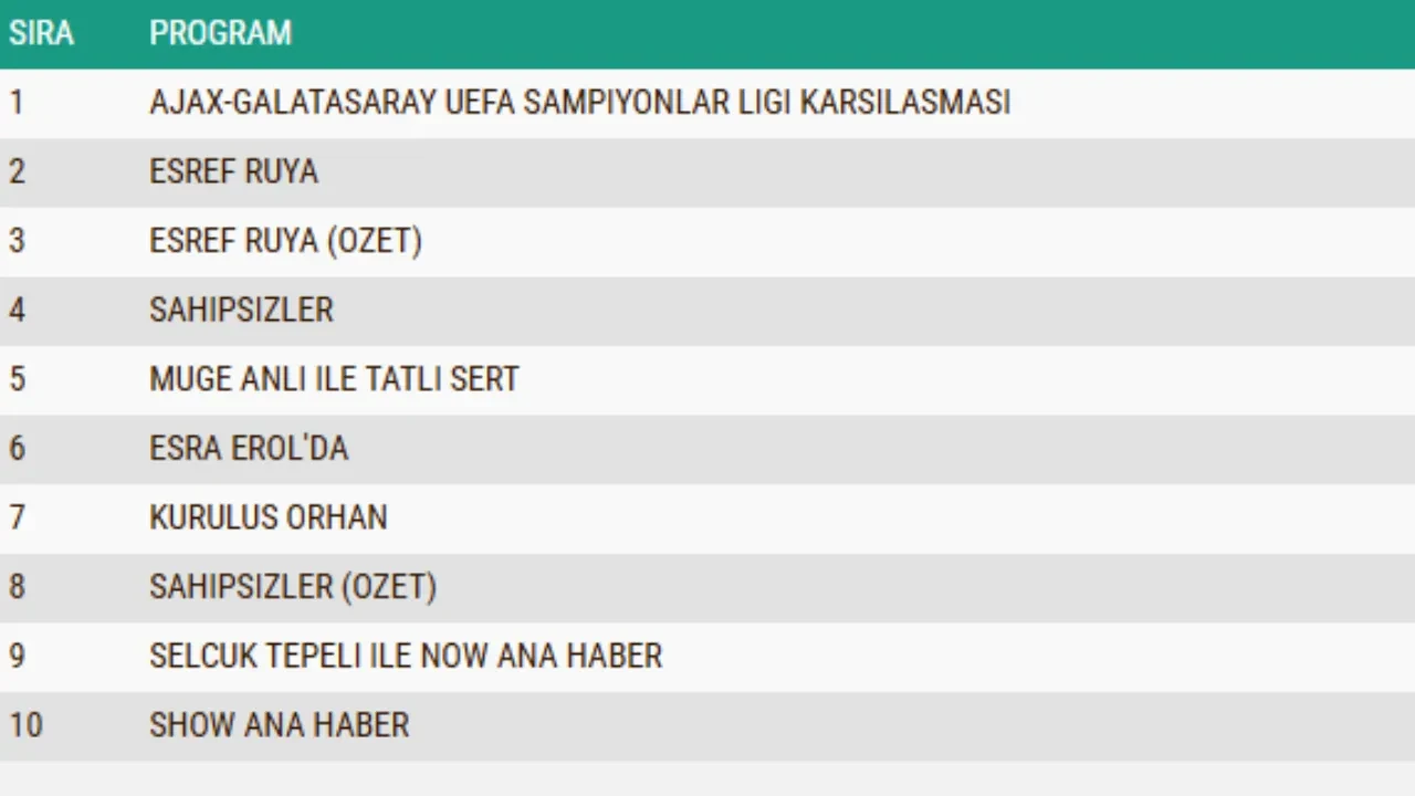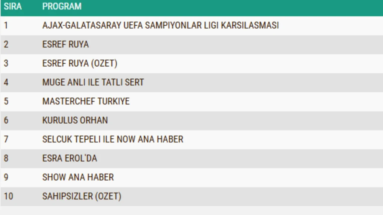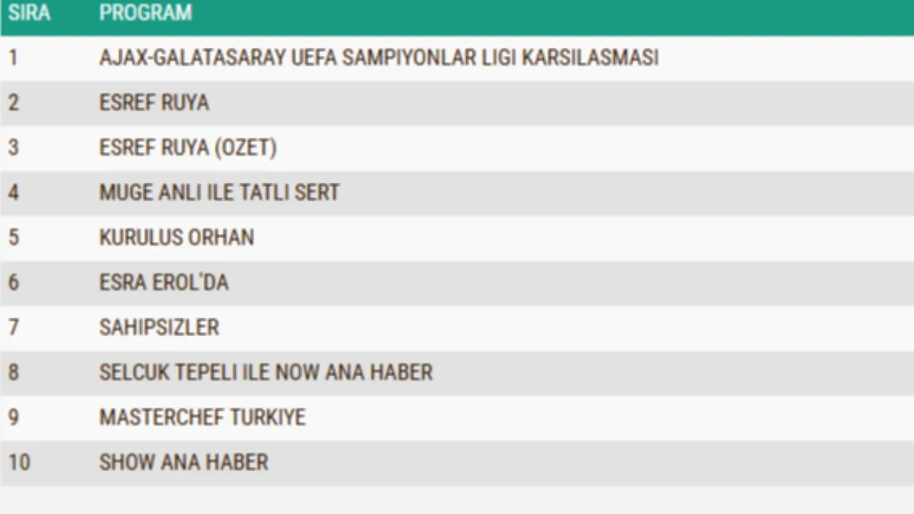 5 Kasım 2025 Çarşamba günü en çok hangi yapımın izlendiğini gösteren reyting sonuçları açıklandı. Buna göre dün akşam tüm reyting gruplarında en çok izlenen program TRT1'de yayınlanan Ajax-Galatasaray maçı oldu. Diğer yandan en çok izlenen dizilere bakıldığında ise Kanal D'de yayınlanan Eşref Rüya dizisinin zirvede olduğu görülüyor. İşte 5 Kasım 2025 reyting sonuçlarının detayları...
