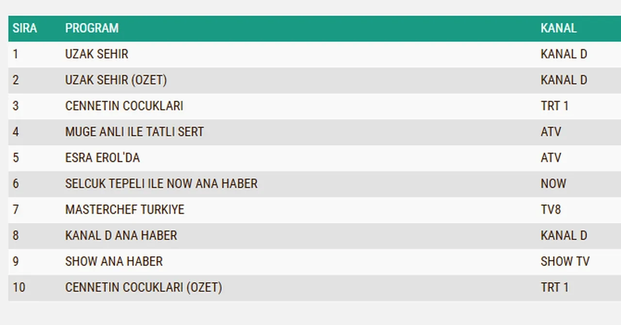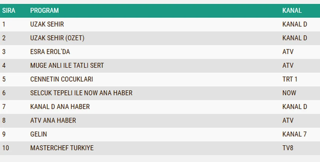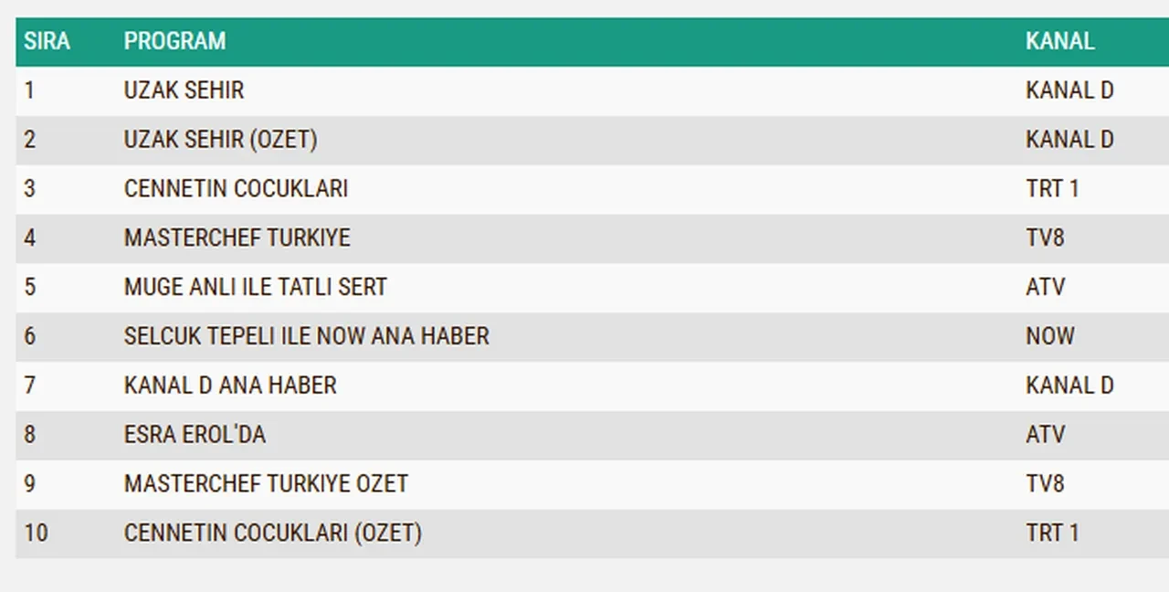 Dün akşam Kanal D’de Uzak Şehir 41. Bölümüyle, TRT1’de Cennetin Çocukları 13. Bölümüyle ekranlara geldi. TV8’de MasterChef All Star’da geçmiş dönemlerin en iyi yarışmacıları en iyi yemeği hazırlamak için zamanla yarıştı. Ayrıca dün akşam Show TV’de Rüya Gibi, Now TV’de Halef: Köklerin Çağrısı dizilerinin tekrar bölümü, Star TV’de yabancı sinema filmi Cehennem ATV’de yerli sinema filmi Dayı: Bir Adamın Hikayesi ekranlarda yer aldı…