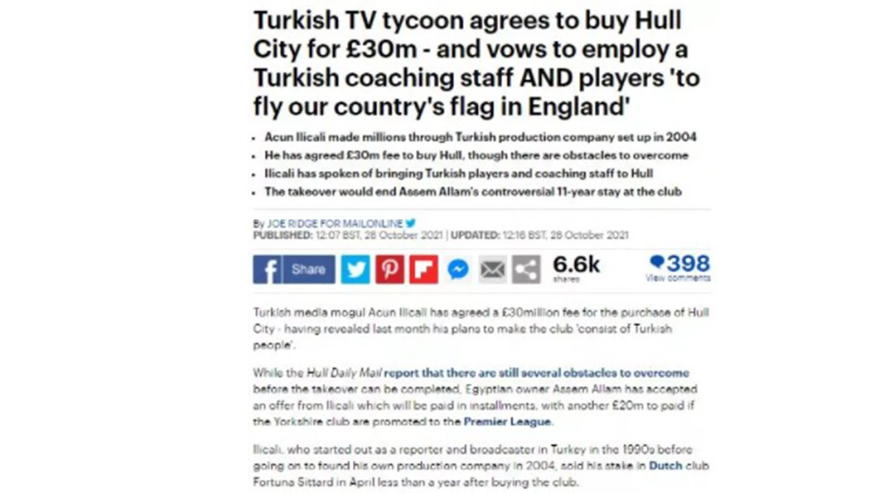 İngiliz basını, Acun Ilıcalı'nın Hull City'yi devralmasının ardından Türk teknik direktör ve bazı Türk futbolcuları kulübe kazandıracağını yazarken; Ilıcalı'nın bu konuya ilişkin sözlerine de yer verdi. Acun Ilıcalı: