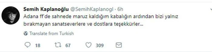 Yaşanan bu olayın ardından Yönetmen Semih Kaplanoğlu, dün Twitter sayfasından yaptığı açıklamada; "Adana ff’de sahnede maruz kaldığım kabalığın ardından bizi yalnız bırakmayan sanatseverlere ve dostlara teşekkürler..." dedi.