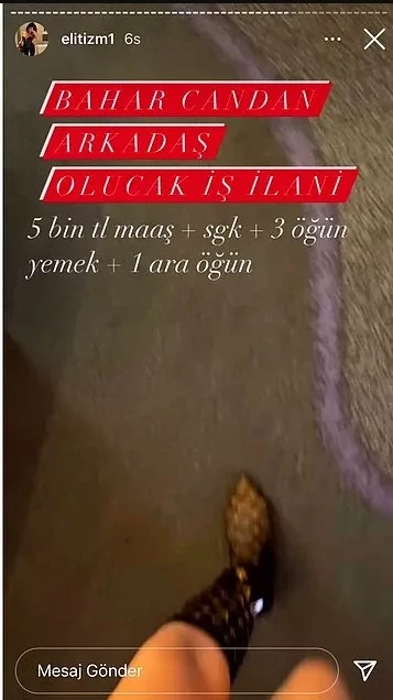 Şimdilerde bir haber programında yorumcu olan Bahar Candan, sosyal medya hesabında yaptığı paylaşımla dikkatleri üzerinde topladı. Daha önce para karşılığı arkadaş aradığını duyuran Candan arkadaşı olmak isteyen kişiye 5000 TL maaş+sigorta+3 öğün yemek ve bir de ara öğün vereceğini söylemişti. O ilanın ardından ünlü isimlerden bile kendisine başvuru geldiğini söyleyen ünlü isim bu kez de yine benzer bir ialnla, ancak bu kez paranın miktarını yükselterek arkadaş aradığını duyurdu.