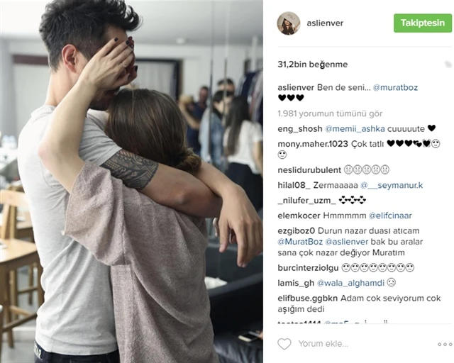 Programı televizyondan takip eden Aslı Enver sevgilisinin bu romantik açıklamalarına sosyal medya hesabından cevap verdi. O anların hemen ardından Instagram hesabından Murat Boz'la birbirlerine sarıldıkları bir fotoğrafı paylaşan Enver, o karenin altına "Ben de seni... Murat Boz" yazıp yan yana üç tane kalp emojisi koydu.