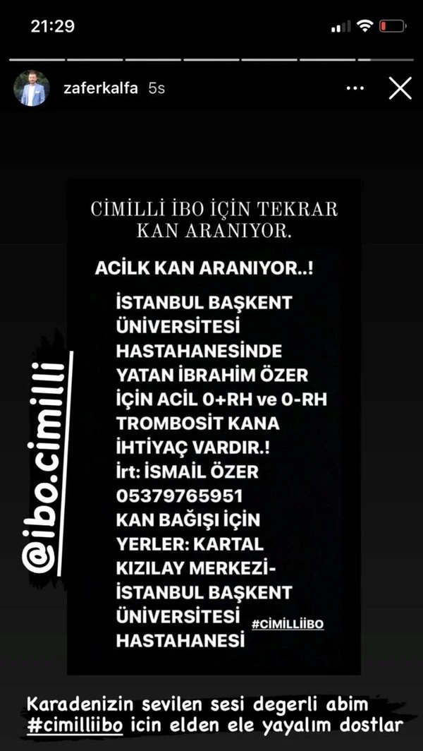 Sanatçı İbrahim Özer (Cimilli İbo) Başkent Üniversitesi Hastanesi yoğun bakım servisine kaldırıldı. Böbrek yetmezliği ve kanında aşırı enfeksiyon tertip edildiği ve durumunun kritik olduğu belirtildi. Ünlü sanatçı için sevenleri de devreye girdi. Cimilli İbo için kan arayışı olduğu öğrenilirken, çok sayıda seveni kanın hızlı şekilde bulunması için sosyal medya hesaplarından çağrı yaptı