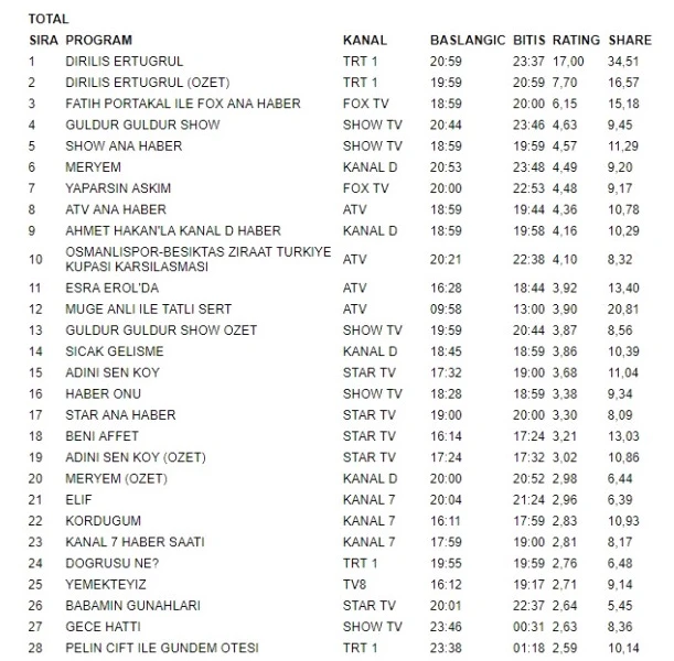 Başrollerinde Mustafa Uğurlu, Kadir Doğulu ve Melisa Sözen'in oynadığı Babamın Günahları dizisi reytinglerde istenilen başarıyı yakalayamadı. Diriliş Ertuğrul'a rakip olarak gösterilen dizi reyting listesinde fenomen diziye yaklaşamadı. Çarşamba günü reyting birinciliğini elden bırakmayan Diriliş Ertuğrul, bu haftada birinci oldu. Diriliş'e rakip olarak başlayan Star TV'nin yeni dizisi Babamın Günahları ise 26. sırada yer bulabildi.