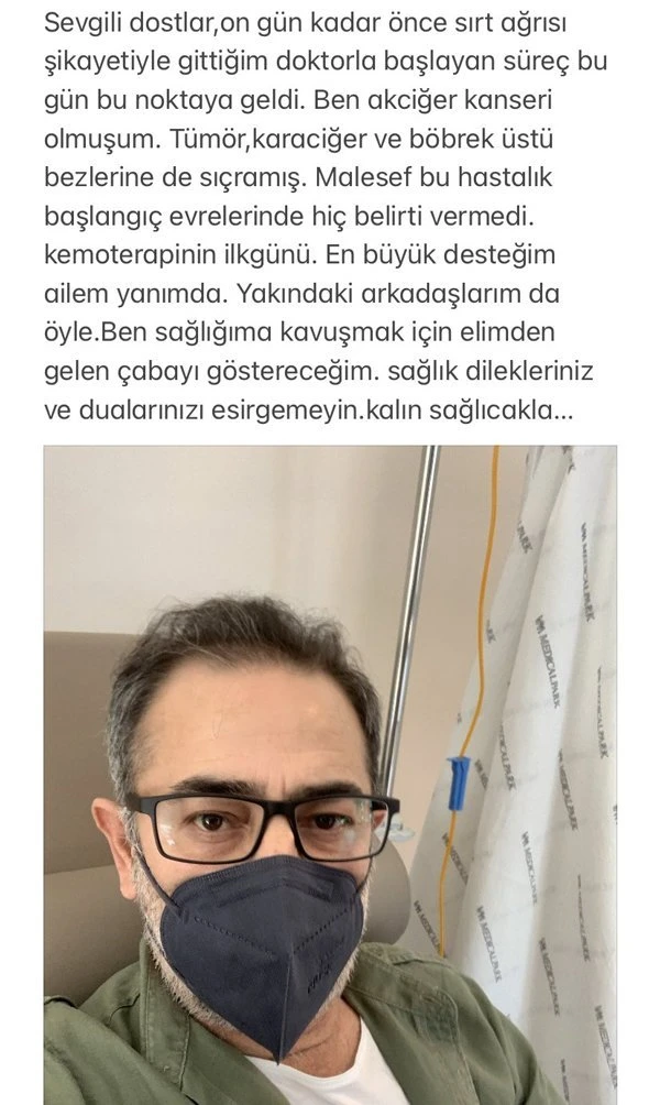 "Sevgili dostlar, 10 gün kadar önce sırt ağrısı şikayetiyle gittiğim doktorla başlayan süreç bugün bu noktaya geldi. Akciğer kanseri olmuşum. Tümör, karaciğer ve böbrek üstü bezlerine de sıçramış. Maalesef bu hastalık başlangıç evrelerinde hiç belirti vermedi. Kemoterapinin ilk günü. En büyük desteğim ailem yanımda, yakındaki arkadaşlarım da öyle. Sağlığıma kavuşmak için elimden gelen çabayı göstereceğim. Sağlık dileklerinizi ve dualarınızı esirgemeyin. Kalın sağlıcakla."