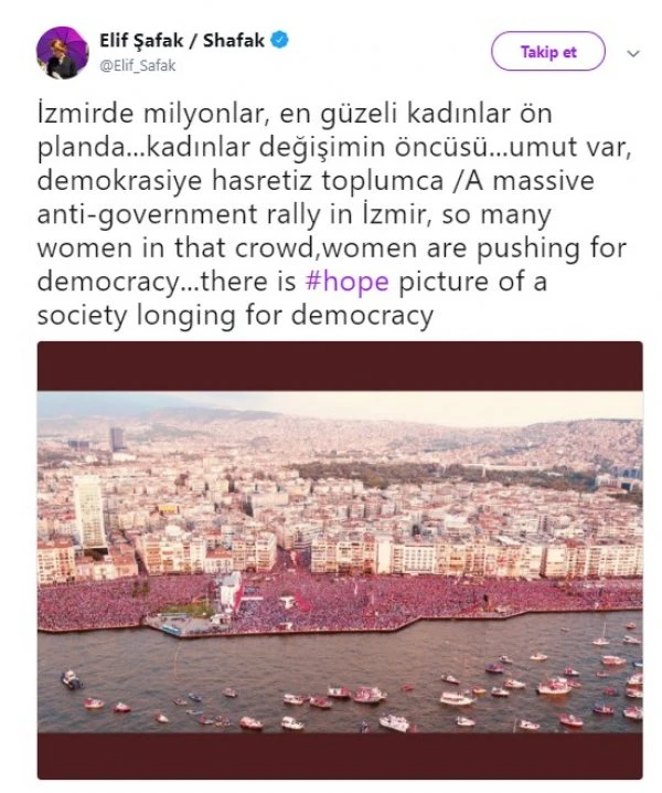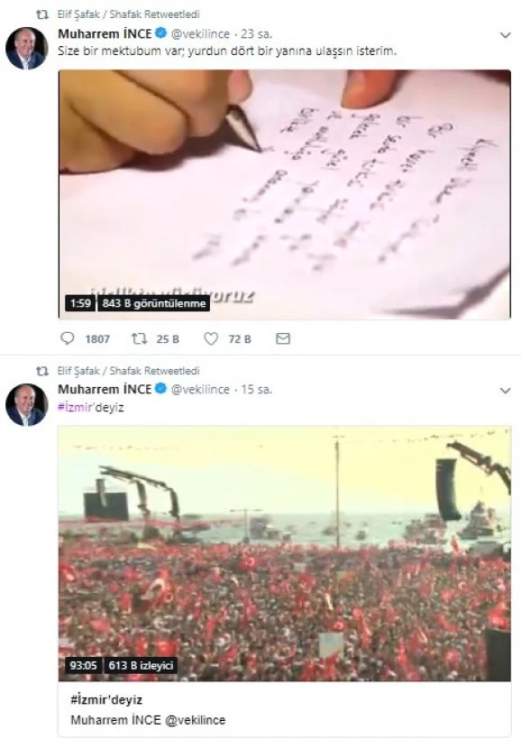 CHP'nin Cumhurbaşkanı adayı Muharrem İnce'nin Twitter hesabından yaptığı paylaşımları RT eden Elif Şafak, İzmir mitinginde kadınların ön sıralarda yer aldığına dikkat çekti.