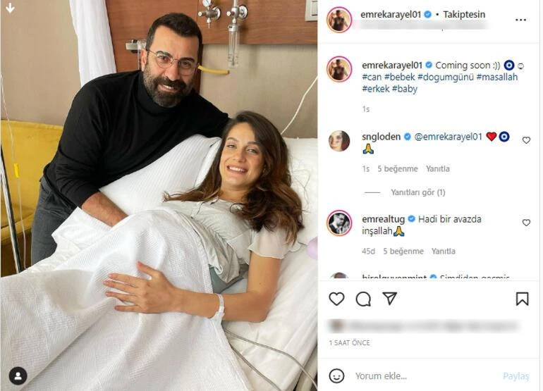 Emre Karayel, hastane odasında çekilen ve eşi Gizem Demirci ile birlikte yer aldığı fotoğrafı "Coming soon" (yakında geliyor) notu ile Instagram'da paylaştı. Çift doğacak oğullarına Can adını verecekleri biliniyor.