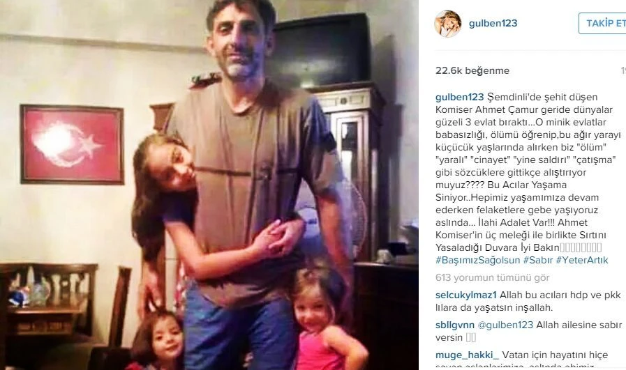 3 çocuk annesi ünlü sanatçı Gülben Ergen de, bu yaşanan acılara isyan etti. Instagram sayfasından Şehit Başkomiser Ahmet Çamur'un 3 kızı ile çekilmiş fotoğrafını paylaşan Ergen şunları yazdı: