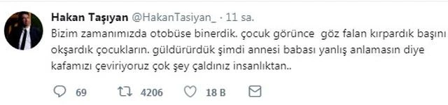 Hakan Taşıyan, "Bizim zamanımızda otobüse binerdik. çocuk görünce göz falan kırpardık başını okşardık çocukların. güldürürdük şimdi annesi babası yanlış anlamasın diye kafamızı çeviriyoruz çok şey çaldınız insanlıktan.." diyerek sosyal medya aracılığı ile tepkisini dile getirdi.